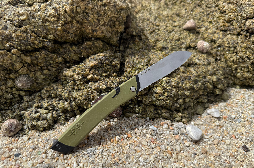 Le Glenn est un couteau traditionnel technique utilisé par les marins bretons. Fabriqué à partir de filets de pêche recyclés, il possède un manche allongé pour une bonne prise en main ainsi qu’une lame de 2,5 mm en inox martensitique MA5. Le cran de sureté a également été travaillé afin de pouvoir l’utiliser en toute sécurité sur un bateau.